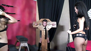 Dude in spandex costume gets his penis pumped by domineering Carmen Rivera