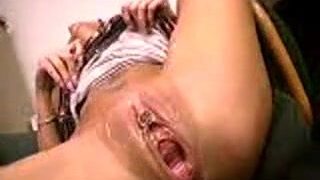 открытая лентами проколотая киска зияет и брызжет