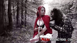 малиновый резиновый капюшон для верховой езды бринд лав получает порку от дровосека на открытом воздухе