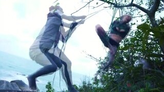 девушка с татуировкой и пирсингом в виде дредхеда связывается лили лу на общественном пляже - кинбаку, шибари, бондаж