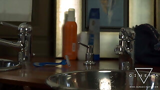 девушка подравнивает подмышки в ванной комнате для гостей, намыливает свои активы 1-3