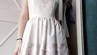 Gentle homemade masturbation in a white sundress and a passionate stormy orgasm