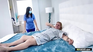 Naughty nurse and torrid brunette gargle and fuck a lucky patient