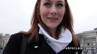 Red-haired German lady gets her mouth filled near the lake
