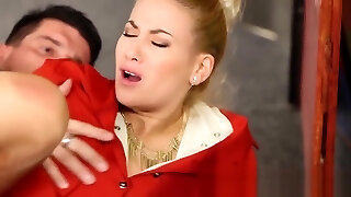 Randy platinum-blonde milf with hefty tits got fucked from the back while in the kitchen